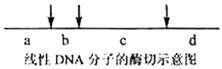 4、(2008全国卷Ⅰ4)已知某种限制性内切酶在一线性DNA分子上有3个酶切位点,如图中箭头所指,如果该线性DNA分子在3个酶切位点上都被该酶切断,则会产生a、b、c、d四种不同长度的DNA片段。现在多个上述线性DNA分子,若在每个DNA分子上至少有1个酶切位点被该酶切断,则从理论上讲,经该酶切后,这些线性DNA分子最多能产生长度不同的DNA片段种类数是( C )