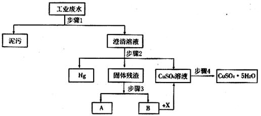 (14分)某工业废水中含有大量CuSO4,少量的Ag+、Hg2+以及部分泥污,通过下述过程可从该废水中回收硫酸铜晶体及其他物质。![]()