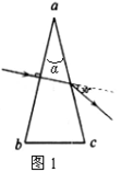 如图,玻璃棱镜的截面为等腰三角形,顶角α为30°.一束光线垂直于ab面射入棱镜,又从ac面射出.出射光线与入射光线之间的夹角为30°,则此棱镜材料的折射率是