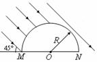 。当光由玻璃射向空气时,发生全反射的临界角为45°,一束与MN平面成45°的平行光束射到玻璃砖的半圆柱面上,经玻璃折射后,有部分光能从MN平面上射出。求能从MN平面射出的光束的宽度为多少?