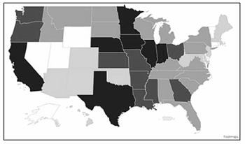 7.下图为美国某种新能源开发潜力的分布差异,图中颜色越深表示潜力越大,则该种新能源最可能是 ( )