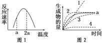 下图1表示温度对酶促反应速率的影响的示意图,图2的实线表示在温度为a时,生成物的量与时间的关系图。则当温度升高一倍时生成物的量与时间的关系是 ( )