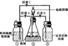 (3)待锥形瓶中的铁屑快反应完时,关闭活塞B、C,打开活塞A,继续产生的氢气会将锥形瓶中的硫酸亚铁(含极少部分未反应的稀硫酸)压到饱和硫酸铵溶液的底部。在常温下放置一段时间,试剂瓶底部将结晶出硫酸亚铁铵。