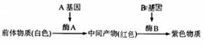 合成了红色中间产物就开红花,合成了紫色物质就开紫花,否则开白花。A基因和B基因分别位于两对染色体上