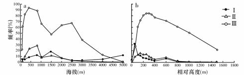 3.读我国不同海拔(a)、相对高度(下滑坡和泥石流灾害的频率分布,I为分布频率、II为发生频率、III为频率比数,读图可知 ( )