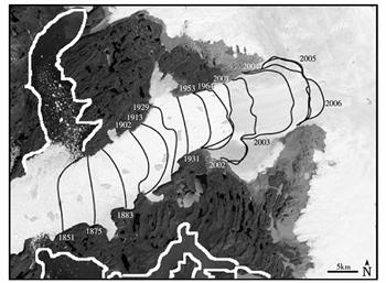 中所标记的1851~2006年间重要年份该冰川前端(冰舌)位置显示 ( )