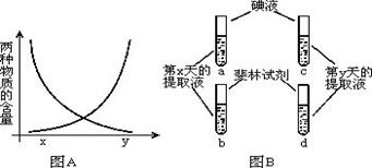 取成熟到第X天和第Y天的等量香蕉果肉,分别加等量的蒸馏水制成提取液,然后在a、b试管中各加5mL第X天的提取液,在c、d试管中各加5mL第Y天的提取液。如图B