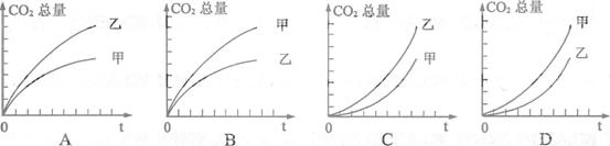 某小组为研究氧气对酵母菌在培养初期产气量的影响,进行了甲、乙2组实验,实验装置如右图所示,除图中实验处理不同外,其余条件相同。一段时间内产生CO2总量的变化趋势是 ( )