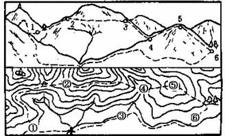 14.读地形图,下图中123456各点的位置,对应在下面的等高线地形图上正确的是