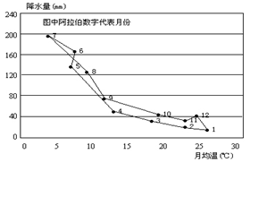 读“某地多年平均月降水量及月均温点散布图”,回答5-6题。