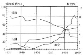 读“我国主要交通运输方式在旅客周转量(亿人千米)所占百分比的变化图”,回答16-17题。