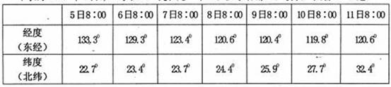 下表为2009年8月第8号台风“莫拉克”中位置移动情况。读表,回答3-5题。