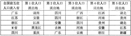 读“近年来全国前五位人口流入大省的人口流出地统计表”,回答8-9题。