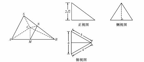 下图分别为三棱锥S-ABC的直观图与三视图,在直观图中,