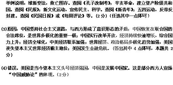 43.(12分)(1)清朝前期,君主专制加强;国家统一,社会稳定;农耕经济高度发达;综合国力强大;中国实行闭关锁国政策,西方人缺乏对中国的了解。(4分)