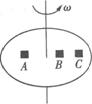 如图所示,用同样材料做成的A、B、c三个物体放在匀速转动的水平转台上随转台一起绕竖直轴转动.已知三物体质量间的关系ma=2mb=3mc,转动半径之间的关系是rC=2rA=2rB,那么以下说法中错误的是:( )