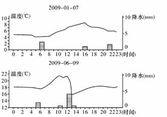 读“某地2009年1月7日和6月9日气温(曲线)和降水(柱状)日变化图”,完成6-7题。