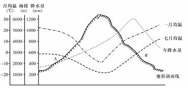 读某地地形剖面图以及气温、年降水量随地形分布示意图,回答8-9题。