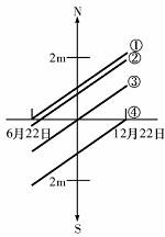 右图中的四条斜曲线表示油头、基多、圣保罗、海口西地6月22日至12月22日正午竿影长度及竿影的朝向,四地的竿长均为2米。读图回答10-11题。