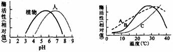 12.左下图表示的是pH值对植物和人的淀粉酶活性的影响;右下图表示的是3种脱氢酶(A、B、C)的活性受温度影响的情况。下列叙述正确的是