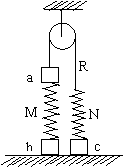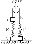 图9中a、b、c为三个物块,M、N为两个轻质弹簧,R为跨过光滑定滑轮的轻绳,它们连接如图9并处于平衡状态。