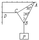 14、如图11所示,细绳AB、CB下悬挂着重20N的重物P,细绳AC与CB垂直,细绳CD呈水平,AB与竖直方向成300角,AC与AB之间也是300角。这时细绳CD所受到的拉力大小是____N。