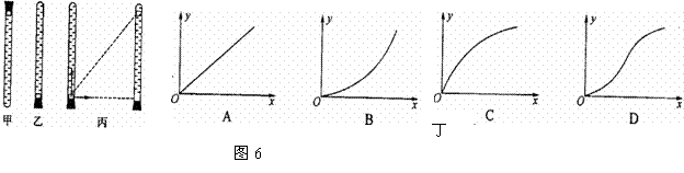 6、如图所示,一玻璃管中注满清水,水中放一软木做成的小圆柱体R(圆柱体的直径略小于玻璃管的直径,轻重大小适宜,使它在水中能匀速上浮),将玻璃管的开口端用胶塞塞紧(图甲).现将玻璃管倒置(图乙),在软木塞上升的同时,将玻璃管水平向右加速移动,观察软木塞的运动,将会看到它斜向右上方运动,经过一段时间,玻璃管移至图丙中虚线所示位置,软木塞恰好运动到玻璃管的顶端.在图丁的四个图中,能正确反映软木塞运动轨迹的是