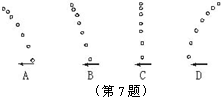 如图所示,火车在水平轨道上以大小为v速度向西做匀速直线运动,车上有人相对车厢以大小为u的速度向东水平抛出一小球,已知v>u,站在地面上的人看到小球的运动轨迹应是(图中箭头表示列车运动的方向)( )