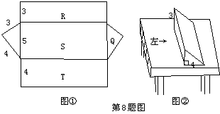 把图①的纸片折成一个三棱柱,放在桌上如图②所示,则从左侧看到的面为………………………………( ▲ )