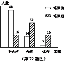 22. (本小题满分8分)某校初三年级全体640名学生在电脑培训前后各参加了一次水平相同的考试,考分都以同一标准划分成“不合格”、“合格”、“优秀”三个等级.为了了解电脑培训的效果,用抽签方式得到其中64名学生的两次考试考分等级,所绘制的统计图如图所示.试结合图示信息回答下列问题: