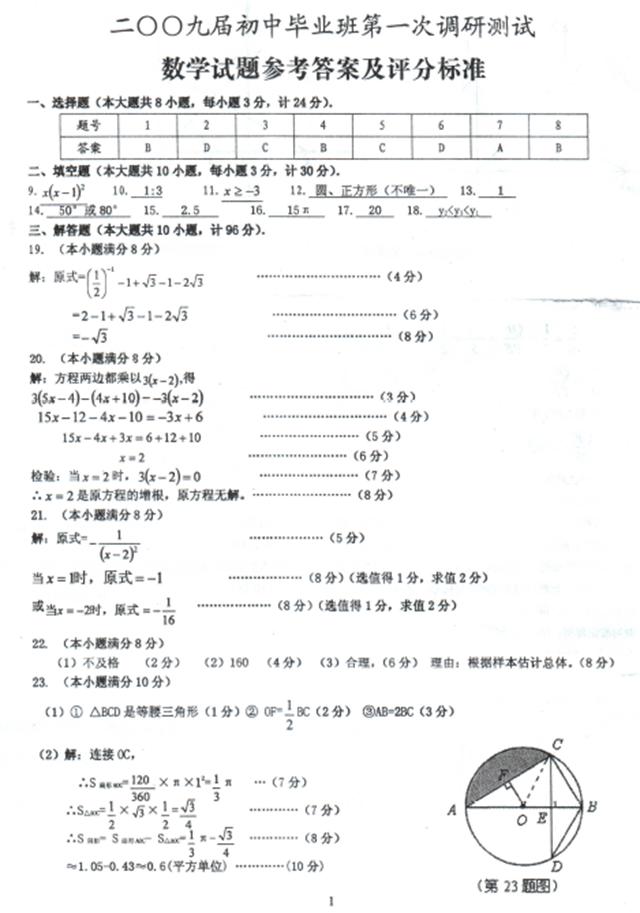 23. (本小题满分10分)如图,AB为⊙O的直径,CD⊥AB于点E,交⊙O于点D,OF⊥AC于点F.