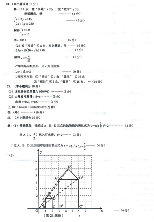 24. (本小题满分10分)商场正在销售 “福娃”玩具和徽章两种奥运商品,已知购买1盒“福娃”玩具和2盒徽章共需145元;购买2盒“福娃”玩具和3盒徽章共需280元.