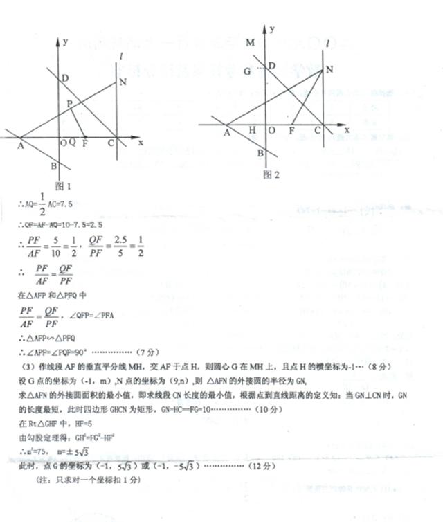 (3)如图2所示,连结NF,求△ AFN外接圆面积的最小值,并求△AFN外接圆面积最小时,圆心G的坐标.