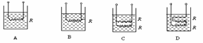 如图所示,已知电阻R1> R2,四个容器中水的质量相等,且初温相等,电路中电源电压相等,欲使四个容器中的水沸腾,则分别最少需要tA 、tB 、tC 、tD分钟,则费时由小到大的排列顺序是 ( )