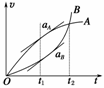 显然,在t1时刻vA>vB,但由于在该时刻图线斜率相同(切线平行),所以aA=aB,在t2时刻vA=vB,但加速度显然有aA<aB.