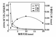 反应结束后,气体中检测到CH4和H2,滤液中检测到HCOOH,固体中检测到镍粉和Fe3O4。CH4、HCOOH、H2的产量和镍粉用量的关系如图所示(仅改变镍粉用量,其他条件不变):