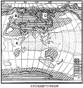[解析]气温年较差的大小因纬度、海陆分布、地形等而异。A地位于赤道附近的刚果盆地,为热带雨林气候,B地位于西欧,为温带海洋性气候,两者海拔都低,降水变化都小。造成A地温度年较差比B地小的原因是A地纬度低,一年中昼夜长短几乎相等,正午太阳高度角的变化也很小,各月热量的收支相差不大,故气温年较差很小。D、E两地纬度相近,造成D地气温年较差小于E地的原因是D地海拔高,可与周围自由空气进行热量交换,且海拔高冬季不受冬季风影响。
