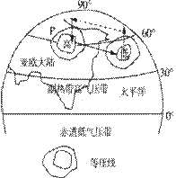 [解析]根据气压带和风带的分布规律丙气压带的风向两边流走,可判定是副热带高气压带。根据风向的偏转方向(向左偏)可判定在南半球,因此甲风带是东南信风带,乙风带是中纬西风带(西北方)。夏半年,东南信风带向北移动,跨过赤道偏转成西南风,给南亚地区带来降水。