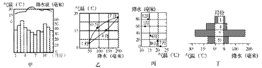 [解析]①③④⑤⑥⑦分别是热带雨林、热带沙漠、地中海、温带海洋性、温带季风和亚热带季风气候,⑧是北海道渔场;甲、乙、丙、丁分别是热带雨林、亚热带季风、地中海和温带季风气候。