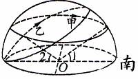 下图为北半球甲乙两地某日“太阳视运动路线图”,圆O为地平圈,箭头为太阳视运动方向,∠1=∠2=22°,读图回答5-7题。