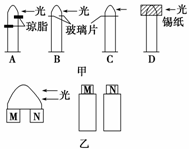 D.图乙中放M的胚芽鞘弯向一侧,而放N的不弯曲