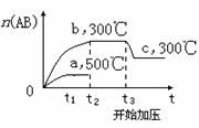 2AB(?);ΔH=-QkJ/mol,当温度和压强改变时n(AB)的变化如下图,下列叙述正确的是 ( )