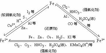 铁是常见的还原剂,在参与化学反应时,一般可失去2e-或3e-而变成Fe2+离子或Fe3+离。铁元素的原子在化学反应中,当遇弱氧化剂(如S、H+、Cu2+、I2等)时,铁只能失去最外层的两个电子,而生成+2价铁的化合物,当遇到强氧化剂(如Cl2、Br2、HNO3等)时,铁原子可以再失去次外层上的一个电子而生成+3价铁的化合物,Fe、Fe2+、Fe3+形成三角关系: