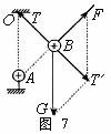 [例5]如图7所示整个装置静止时,绳与竖直方向的夹角为30º。AB连线与OB垂直。若使带电小球A的电量加倍,带电小球B重新稳定时绳的拉力多大?