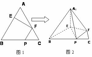在正三角形ABC中,E、F、P分别是AB、AC、BC边上的点,满足AE:EB=CF:FA=CP:PB=1:2(如图1)。将△AEF沿EF折起到