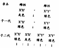 第二组:雌性ff×雄性FF→F1绿色→F2绿色:灰色=3:1,且灰色为雌性
