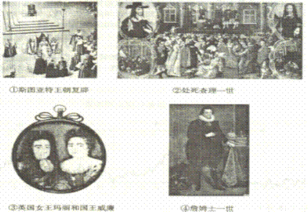 (1)按照英国清教徒革命的发展进程将上述图像排序,并据此概述革命期间的政体变化。(12分)