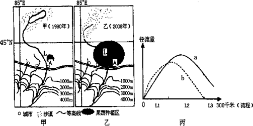 2008年9月3日,可口可乐公司拟收购汇源果汁的消息传出,在全国引起了不小的震动。图19为我国某区域图,其中甲、乙两图是该区域不同年份的地图,汇源果汁番茄汁的原料主要来自图中的A地区,丙图是L河流不同年份全流域流量上中下游的变化曲线图,读图回答(1)一(3)题。(12分)