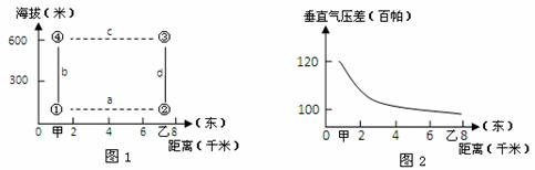 读下面两幅图,图1为某城市地区城市风形成的热力环流剖面图,图2显示0米与600米的垂直气压差分布状况,读图回答3-4小题。