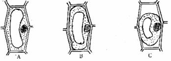 46、将一张洋葱鳞片叶放在某一浓度的蔗糖溶液中,制成装片,放在显微镜下观察,有3种状态的细胞(如图),你认为这3个细胞在未发生上述情况之前,其细胞液的浓度依次是